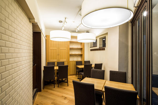 ファサードには大きなフルオープンドアを配置し、日中は街に開かれた印象を与える明るいレストラン、夜はオープンドアのガラスから印象的なペンダントライトがのぞき見える、品の良いレストランになっています。