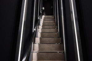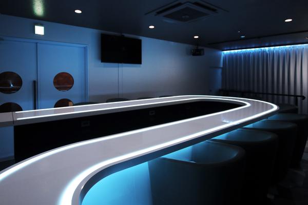 デザインコンセプトにはサイバー感をモチーフにし、硬くなりすぎずどこか落ち着いて柔らかい印象を与えるベビーブルーを壁面と間接照明に用いた。