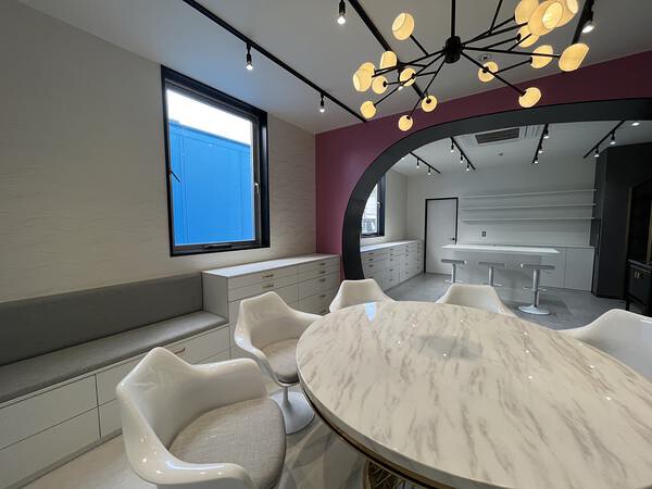 このラボは、お客様が化粧品のオリジナルカラーをつくれたり、商品のサンプルを試すことができるスペースになります。女性の方に心地よく、お過ごしいただけるよう、上質感とやさしい空間づくりを心がけました。家具を照明は全て海外でオーダーメイドしていますので、品質が良く、コストも抑えることができました。
