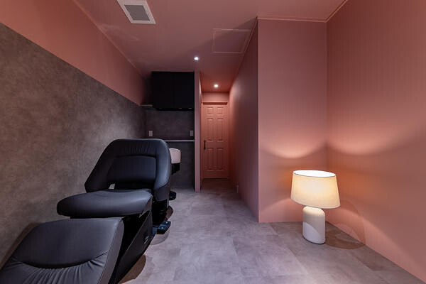 モダンテイストのプライベートサロン。Rのカウンターや壁面のアーチ、異曲ミラーなど、曲線を多用することで女性らしい柔らかさを演出した空間です。パープルのレースカーテンは、その波打つフォルムや透け感を活かし、上品で魅力的な雰囲気を演出。さらに、天井に吊るしたドライフラワーがアクセントとなり、華やかさをプラス。アーチの奥に広がるシャンプーエリアは、グレイッシュピンクで統一し、落ち着いたリラックス空間に仕上げました。